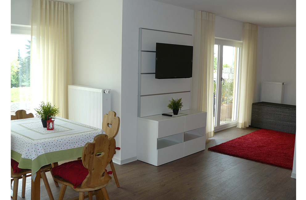 Unsere große Ferienwohnung A bietet mit ca. 62 qm Wohnfläche Platz für 4 Personen und hat eine große Terrasse mit herrlichem Blick auf den großen Brombachsee.